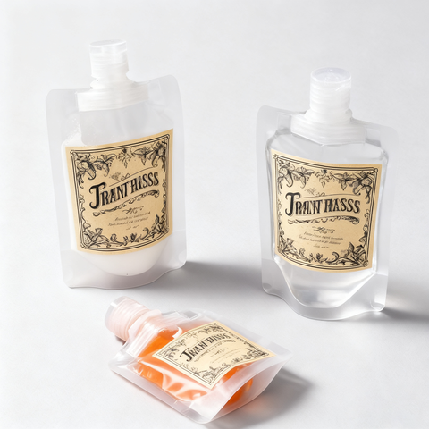 ถุงบรรจุภัณฑ์สำหรับเติมน้ำซุปใสพร้อมจุกขวดใสขนาด100มล. 500มล. ทำจาก PE ซักล้างด้วยมือ